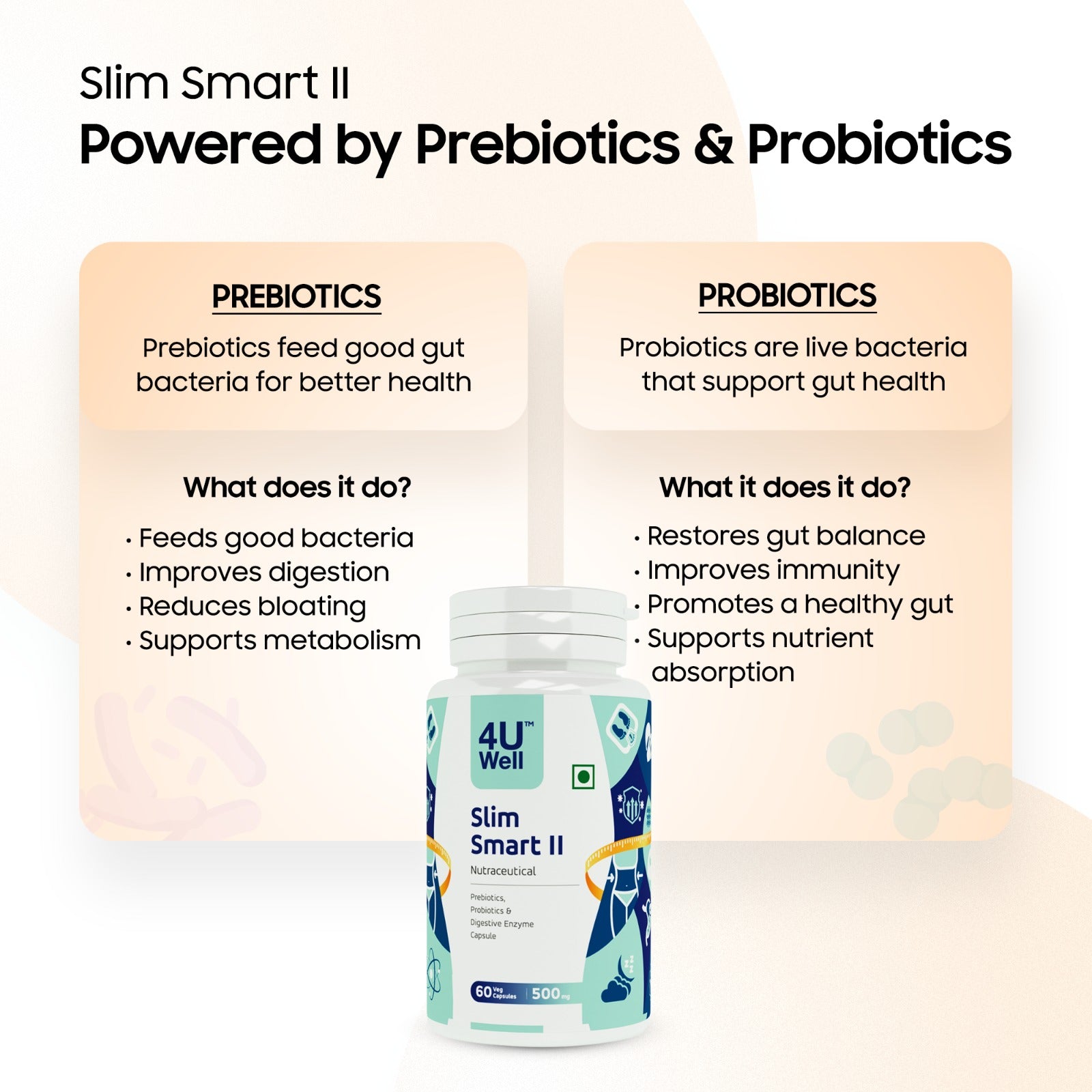 Slim smart II is a scientifically-formulated blend of probiotics, prebiotics and digestive enzymes designed to support gut health, weight management, and immune function.